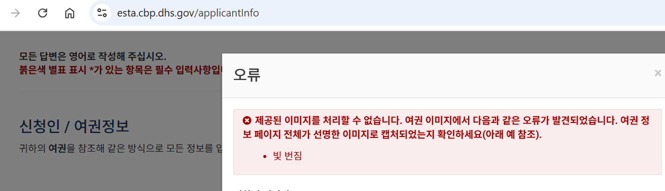 사진 오류 주의 제공된 이미지를 처리할 수 없습니다. 여권 이미지에서 다음과 같은 오류가 발견되었습니다. 여권 정보 페이지 전체가 선명한 이미지로 캡처되었는지 확인하세요(아래 예 참조).