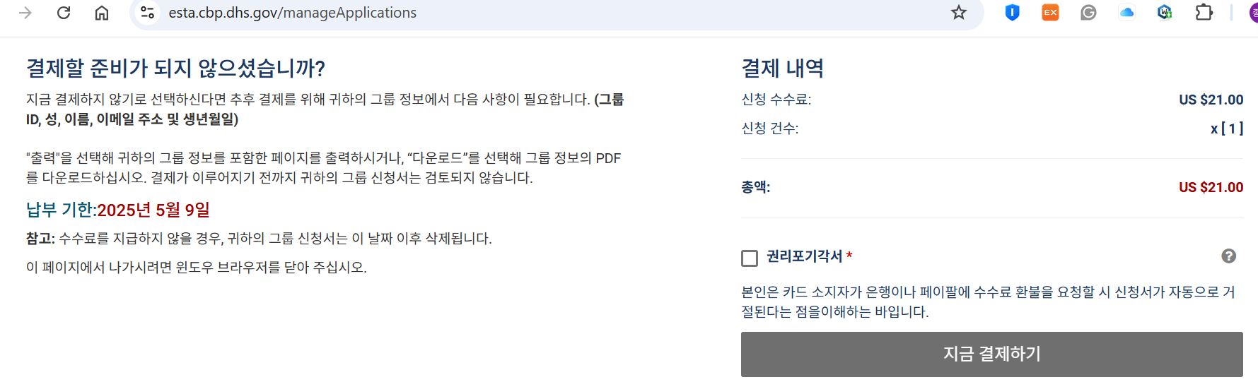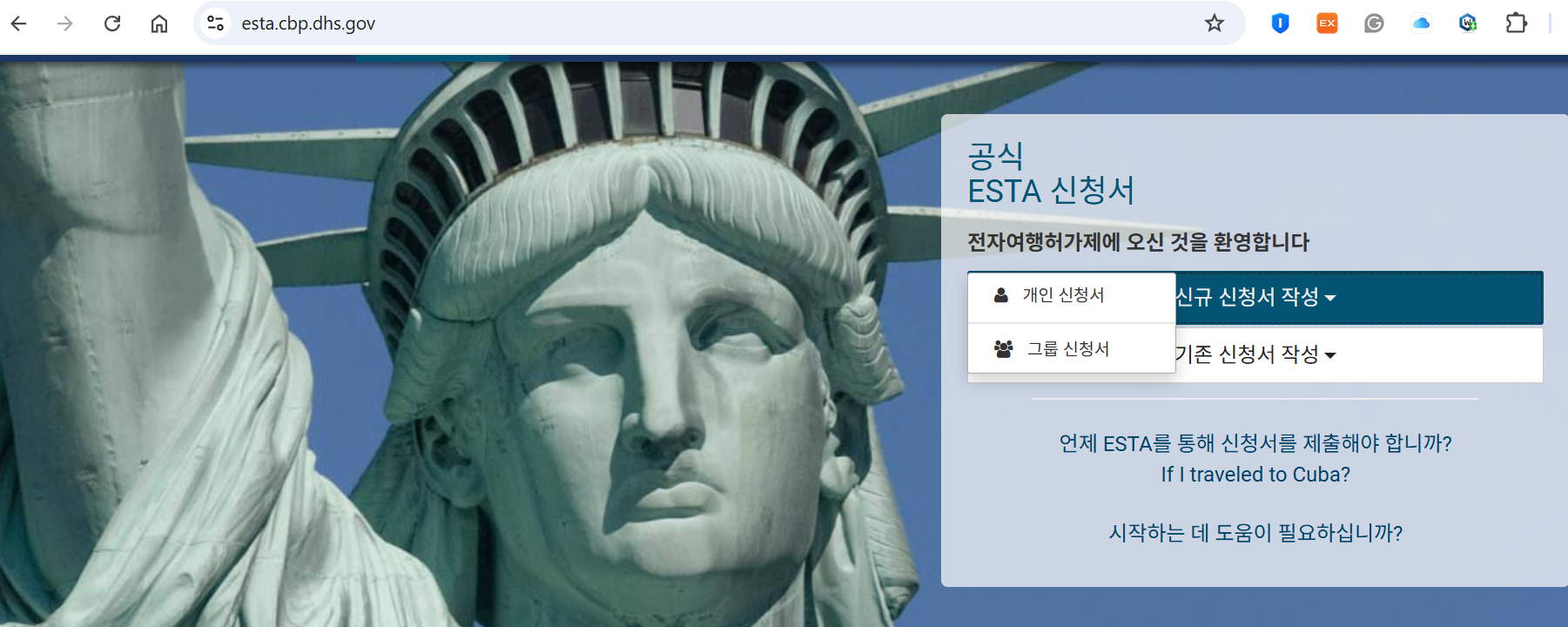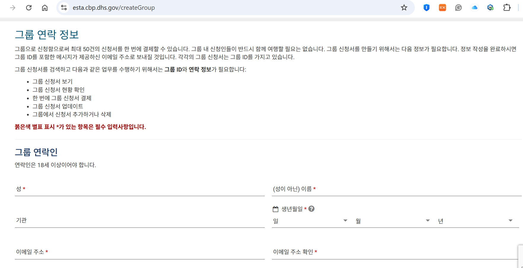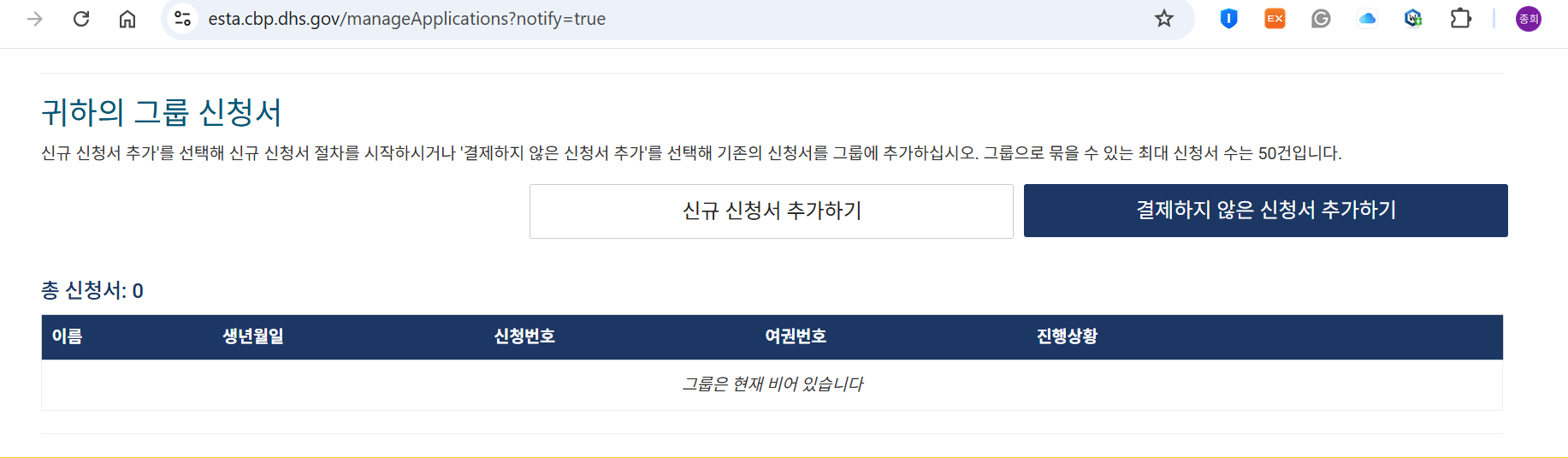 신규 신청서 추가'를 선택해 신규 신청서 절차를 시작하시거나 '결제하지 않은 신청서 추가'를 선택해 기존의 신청서를 그룹에 추가하십시오. 그룹으로 묶을 수 있는 최대 신청서 수는 50건입니다.